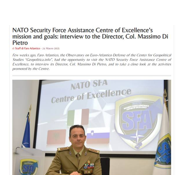NATO SFA COE Director, Col. Massimo Di Pietro interviewed by FARO ATLANTICO News NATO SFA COE Director, Col. Massimo Di Pietro interviewed by FARO ATLANTICO Euro-Atlantic Defence Observatory’s “Faro Atlantico” of the “Centro Studi Geopolitica.info” visited the NATO Security Force Assistance…NSFACOE ®24 March 2021