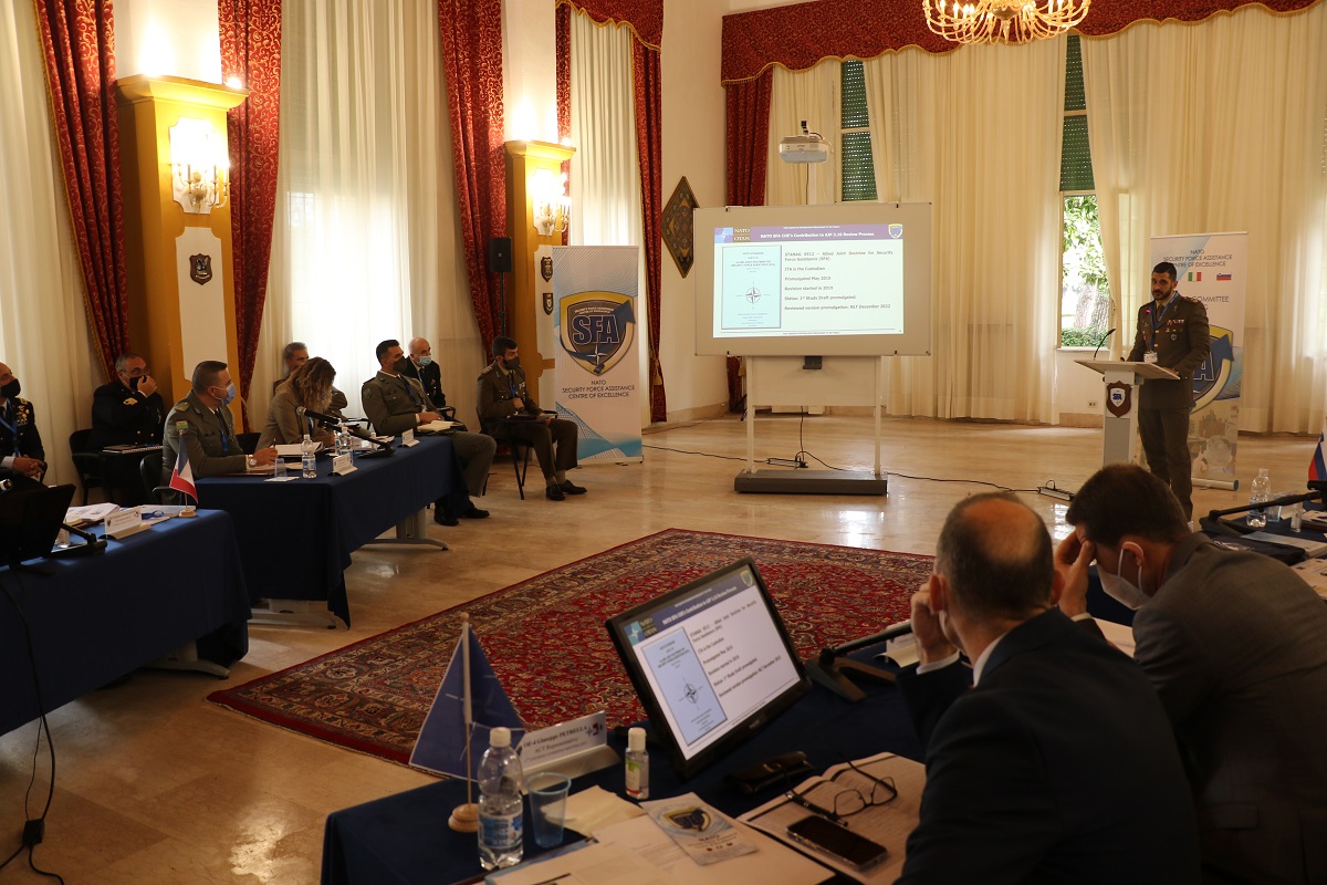 After the Chairperson’s and the Allied Command for Transformation (ACT) representative’s welcome address, the NATO SFA COE Director, Col. Massimo Di Pietro, provided an update on the main activities carried out in 2021. In particular, he mentioned the recent successful renewal of the Centre’s NATO accreditation, for having ensured continuity in compliance with the high standards envisaged and for the numerous initiatives undertaken to encourage collaboration between the Centre, NATO and Partner Countries.